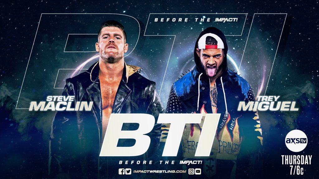 Your night begins with an all-new Before the IMPACT, this Thursday at 7/6c on AXS TV! Join Jon Burton, Gia Miller and Josh Mathews as they bring you all things IMPACT, including a must-see exclusive match! The dominant Steve Maclin has demanded more competition and he’s going to get it when he battles Trey Miguel.