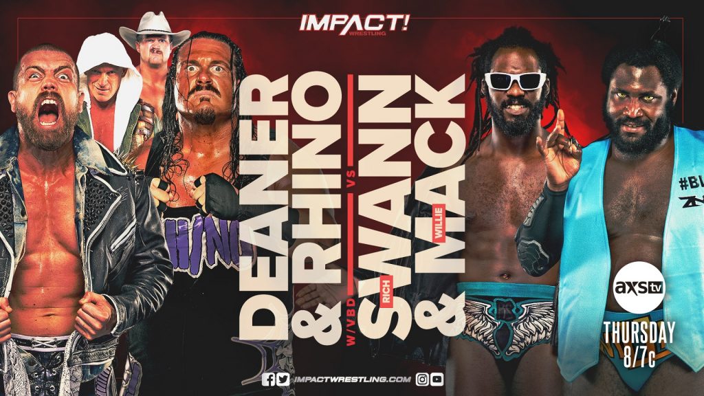 Violent By Design‘s plans fell through at Slammiversary when they lost the IMPACT World Tag Team Titles to The Good Brothers in a four-way match also involving Rich Swann, Willie Mack, Fallah Bahh and No Way. VBD’s maniacal leader, Eric Young, is blaming Swann and Mack for that loss and their first measure of revenge came just days later via a blindside attack. This Thursday on IMPACT!, the war continues when Young sends Deaner and Rhino into battle against Rich Swann and Willie Mack!